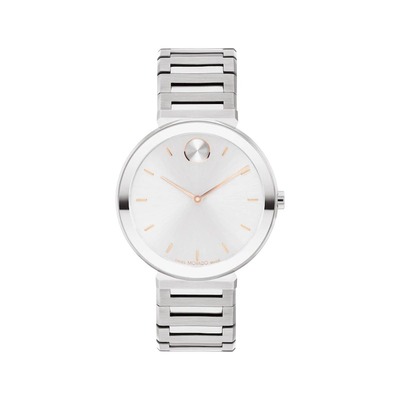 Silver-tone stainless steel case and bracelet. Fixed silver-tone stainless steel bezel. Silver dial with rose gold-tone hands and index hour markers. Movado dot appears at the 12 o'clock position. Dial Type: Analog. Quartz movement. Scratch resistant K1 crystal. Pull / push crown. Solid case back. Round case shape, case size: 34 mm. Deployment clasp. Water resistant at 30 meters / 100 feet. Functions: hour, minute. Bold Horizon Series. Dress watch style. Watch label: Swiss Made. Movado Bold Horizon Quartz Silver Dial Ladies Watch 3601090.