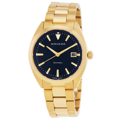 Yellow gold IP stainless steel case and bracelet. Fixed yellow gold IP stainless steel bezel. Blue dial with gold-tone hands and index hour markers. Minute markers around the outer rim. Dial Type: Analog. Luminescent hands and markers. Date display at the 3 o'clock position. Quartz movement. Scratch resistant sapphire crystal. Pull / push crown. Solid case back. Round case shape, case size: 39 mm. Deployment clasp. Water resistant at 50 meters / 165 feet. Functions: date, hour, minute, second. Heritage Series. Casual watch style. Watch label: Swiss Made. Movado Heritage Quartz Blue Dial Mens Watch 3650143.