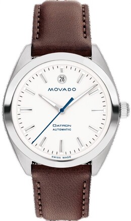 Silver-tone stainless steel case with a chocolate leather strap. Fixed silver-tone stainless steel bezel. White dial with silver-tone hands and index hour markers. Minute markers around the outer rim. Dial Type: Analog. Luminescent hands and markers. Date display at the 12 o'clock position. Automatic movement. Scratch resistant sapphire crystal. Pull / push crown. Transparent case back. Round case shape, case size: 40 mm. Tang clasp. Water resistant at 50 meters / 165 feet. Functions: date, hour, minute, second. Heritage Series. Casual watch style. Watch label: Swiss Made. Movado Heritage Automatic White Dial Mens Watch 3650145.