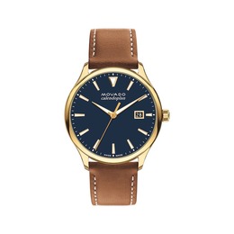 Yellow gold IP stainless steel case with a cognac leather strap. Fixed yellow gold IP stainless steel bezel. Blue dial with gold-tone hands and index hour markers. Minute markers around the outer rim. Dial Type: Analog. Luminescent hands and markers. Date display at the 3 o'clock position. Quartz movement. Scratch resistant sapphire crystal. Pull / push crown. Solid case back. Round case shape, case size: 40 mm. Tang clasp. Water resistant at 30 meters / 100 feet. Functions: date, hour, minute, second. Heritage Series. Casual watch style. Watch label: Swiss Made. Movado Heritage Quartz Blue Dial Mens Watch 3650157.