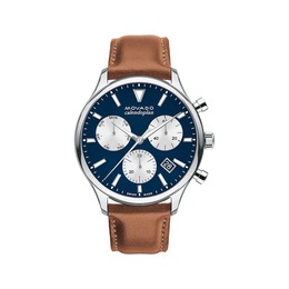Silver-tone stainless steel case with a brown leather strap. Fixed silver-tone stainless steel bezel. Blue dial with silver-tone hands and index hour markers. Minute markers around the outer rim. Dial Type: Analog. Luminescent hands and markers. Date display between 4 and 5 o'clock position. Three sub-dials displaying: 60 second, 30 minute and day. Quartz movement. Scratch resistant sapphire crystal. Pull / push crown. Solid case back. Round case shape, case size: 43 mm. Tang clasp. Water resistant at 30 meters / 100 feet. Functions: chronograph, date, day, hour, minute, second. Heritage Series. Sport watch style. Watch label: Swiss Made. Movado Heritage Chronograph Quartz Blue Dial Mens Watch 3650161.