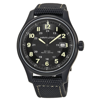 Black PVD titanium case, black textile strap with tang clasp. Fixed black PVD bezel. Black analog dial featuring luminous black sword hands and Arabic numeral hour markers including 24 GMT indicators. Minute markers at five-minute intervals on the outer rim. Date display at the three o'clock position. Powered by Hamilton Calibre H-10 automatic movement based on ETA C07.111 with 25 jewels, 21600 vph accuracy and an 80-hour power reserve. Scratch-resistant sapphire crystal. Pull/push crown operation. Skeleton case back. Round shape measuring 42mm diameter by 11mm thickness. Strap width of 21 mm. Water resistant up to 100 meters / 330 feet.