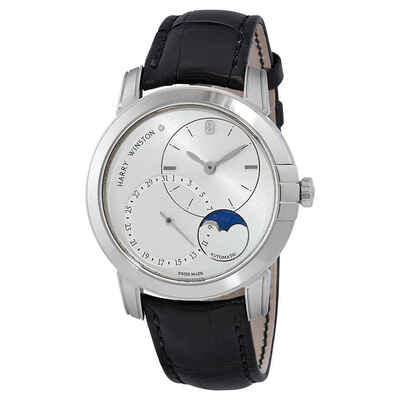 Mens automatic watch with moon phase, silver dial and white gold case. Features Roman numeral hour markers, leaf-shaped hands, date display at 7 o'clock, fixed bezel, sapphire crystal glass, visible case back, black alligator leather strap with pin buckle. Movement: Harry Winston Calibre HW3203 Automatic containing 28 Jewels, beats per hour (bph): 28800 vph (approx. 414 bph). Water resistant to 30 meters / 100 feet. Swiss Made.