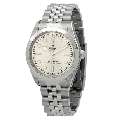 Automatic chronometer movement Tudor Calibre MT5602, featuring a light champagne dial with silver-tone hands and index hour markers (including luminescent). Silver-tone stainless steel case and bracelet. Fixed silver-tone stainless steel bezel. Scratch resistant sapphire crystal. Screw down rotating bezel claw system. Analog dial type showing hours, minutes, seconds including minute markers around the outer rim. Includes date function at 3 o'clock. Fold over clasp with safety lock on strap. Water resistant to 100 meters (approx. 330 feet).