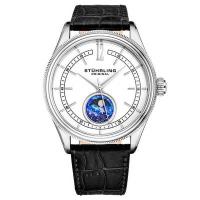 a white dial dress watch from the Stuhrling Original Symphony collection with model number M15520 featuring an analog display movement. Silver-tone stainless steel case presented on a black leather strap band. The face includes luminous silver-tone hour markers and hands designed for easy reading, along with minute markers around the perimeter of the dial. It comes equipped with a scratch-resistant mineral crystal lens cover and features a fixed bezel finish. Powering this timepiece is a reliable quartz mechanism ensuring accurate timekeeping. With its 42 mm round case measuring 10 mm in thickness, it includes a solid case back closure type pull / push crown and buckle clasp for secure fastening. The watch has water resistance capabilities up to 50 meters (165 feet) suitable for everyday splashes but not professional diving.
