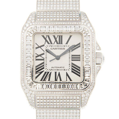 A Cartier Santos men's watch with automatic movement, featuring a white dial accented by 18kt white gold set diamonds. Includes blued-steel sword-shaped hands and Roman numeral hour markers against an inner minute track scale. The entire solid case back, bezel, and bracelet are crafted from 18kt white gold and embellished with additional diamonds. Square shape measuring 41 mm in diameter; equipped with a scratch-resistant sapphire crystal lens and cabochon crown. Secured by a fold over clasp with safety release mechanism. Functions include hour, minute, and second indications. Comes complete with original box, international warranty card, manual (all accessories included).