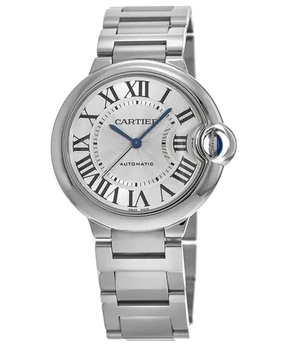 A brand new authentic Cartier Ballon Bleu automatic watch with a 36mm stainless steel case, interchangeable stainless steel link bracelet, deployment clasp, and fixed bezel. The silver dial features blue steel sword-shaped hands and Roman numeral hour markers. Powered by an automatic movement, providing hours, minutes, seconds functions. Equipped with a fluted crown set with a synthetic cabochon spinel, scratch-resistant sapphire crystal glass, solid case back, and is water resistant to 30 meters (100 feet). Comes with a 2-year WatchMaxx warranty.