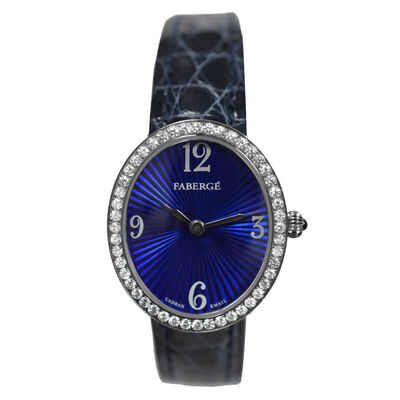 An Anastasia series ladies watch with a quartz movement, oval case in white gold (size 24mm), fixed white gold bezel set with diamonds. Features a blue dial accented by silver-tone hands and Arabic numeral hour markers. Equipped with a blue leather strap secured by a buckle clasp. Analog functions display only.