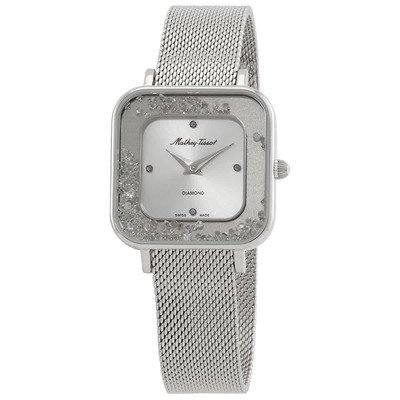 a ladies' watch from the Gemina series featuring a rose gold-tone stainless steel case and bracelet, fixed bezel with push-pull deployment clasp. Silver dial displays analog time with minute markers and rose gold-tone hands. Quartz movement by Ronda Caliber 762 powers this dress style timepiece labeled Swiss Movt. Protected by sapphire crystal resistant to scratches. Comes complete with screw-down case back and is water resistant up to 50 meters.