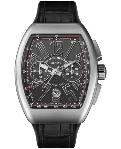 A men's automatic timepiece from Franck Muller featuring a polished stainless steel case, black alligator leather strap with folding clasp. The grey dial displays silver tone hands and Arabic numeral hour markers with minute markers around the outer rim. Equipped with chronograph sub-dials for 30-minute and 60-second functions powered by MVT FM 7000-C2-DT movement, providing a date display at 6 o'clock, scratch resistant sapphire crystal lens, tonneau case shape measuring 53.7mm x 45mm with solid case back. Water resistant to 30 meters (100 feet). Model number V45CCACB comes with a 2 year WatchMaxx warranty.