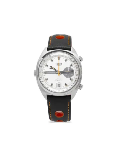 Pre-owned Tag Heuer Carrera Chronograph from 1970 featuring a white dial with index hour markers and hands, date indication, seconds sub-dial, tachymeter scale, automatic movement, polished stainless steel case finish, logo-embossed crown, round face. Includes original CHRONEXT certificate verifying authenticity and guaranteeing repairs under the two-year warranty. Chronograph pushers are present, a leather strap is fitted with pin-buckle fastening. Comes in its CHRONEXT box.