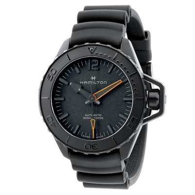 A Hamilton mens automatic watch with black dial and black stainless steel case. Features a black rubber strap, screw down bezel, luminous markers and hands for night readability. Powered by the automatic H-10 movement (based on ETA C07.111) containing 25 jewels, offering approximately 80 hours power reserve at 21600 vph. Includes analog functions with seconds display. Comes equipped with a sapphire crystal scratch resistant glass and is water resistant to 300 meters / 1000 feet. This Swiss made dive watch style watch belongs to the Khaki Navy Frogman Series.