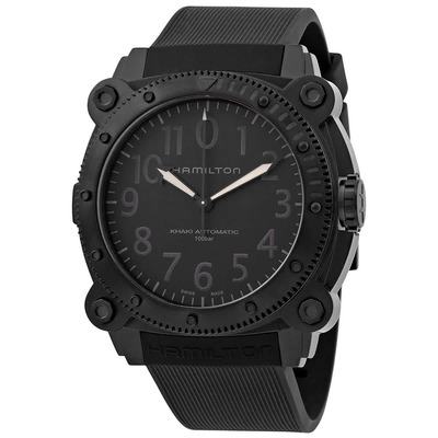 PVD black titanium case. PVD black titanium bezel (if applicable). Black rubber strap band with width of 22 mm and tang clasp. Black analog dial featuring black hands, Arabic numeral hour markers, minute markers on the outer rim, luminescent hour/minute/second markers for light conditions, and a screw-down crown. Equipped with Hamilton Caliber H-10 automatic movement ensuring reliable timekeeping without manual winding (indicates an auto mechanical movement). Includes scratch-resistant sapphire crystal glass for the watch face providing high durability against damage. The round case has a size of 46 mm in diameter. Comes with a solid case back and is rated water resistant to 100 meters / 330 feet depth.