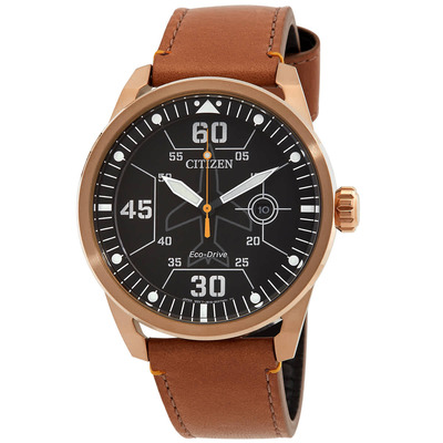45 mm round stainless steel case with rose gold-tone bezel. Brown leather strap. Black dial featuring silver-tone hands and index hour markers, plus luminous markings for low-light visibility. Analog display includes a minute hand with markers around the outer rim. Fixed solid case back. Water resistant up to 100 meters / 330 feet (jet skiing level). Powered by Citizen Eco-Drive J811 movement; solar powered, perpetual light mode.