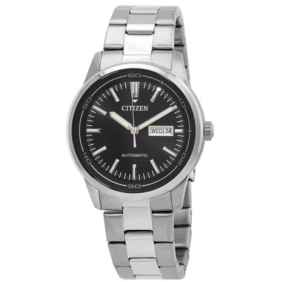 Silver-tone stainless steel case and bracelet with fixed silver-tone bezel. Analog black dial features silver-tone hands, index hour markers, minute markers around the outer rim, day of week and date display at 3 o'clock position. Powered by Citizen Caliber 8200 automatic movement (Japan). Equipped with scratch resistant mineral crystal lens, pull/push crown, transparent case back. Round case shape measuring 42 mm diameter and 12.5 mm thickness. Secured by a fold over clasp with safety release mechanism. Water resistant to 100 meters / 330 feet depth.