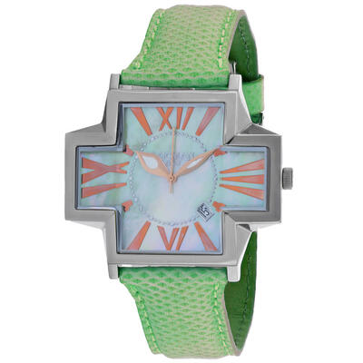 Silver-tone stainless steel case, green leather strap with fixed bezel, mother of pearl dial accented by rose gold-tone hands and Roman numeral hour markers. Analog display features a date function positioned between the fourth and fifth hour marks. Powered by a quartz movement for precise timekeeping, protected by scratch-resistant mineral crystal. Equipped with a pull/push crown and measures water resistance up to 50 meters (165 feet). Unique case shape dimensions are 40 mm diameter and 8 mm thickness; band width is 15 mm with a length of approximately 7.5 inches suitable for wrist size, secured by a buckle clasp closure system. Includes second hand function.