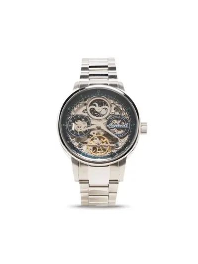 Automatic movement, silver-tone stainless steel case. Round face with skeleton dial and baton hands. Features moonphase indication and chronograph counter complications. Screw-down crown and adjustable link bracelet with concealed clasp fastening.
