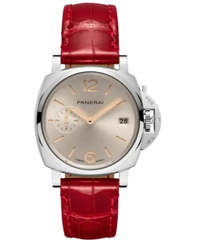 Brand New Authentic Panerai Luminor Due Model PAM01248. Polished Stainless Steel case, Shiny Arancia Rossa Alligator leather strap with tang clasp and fixed bezel. Features an Ivory dial with Rose Gold tone hands, Index/Arabic numeral hour markers, small seconds sub-dial. Equipped with automatic movement (Calibre P.9000), date function at 3 o'clock powered by a mechanical engine providing 72 hours power reserve. Offered functions include: Hour, Minute, Second, Date and Power Reserve display. Features scratch resistant Sapphire crystal, cushion shape case measuring 38mm in diameter with solid back. Rated for 30 meters water resistance (approx. 100 feet) and comes with a 2 year WatchMaxx warranty.