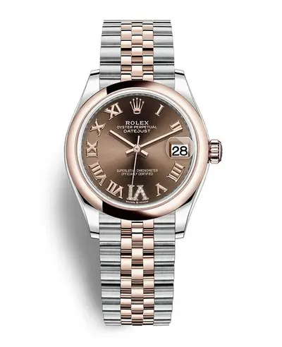 31 Steel and 18kt Everose Gold Chocolate Dial Women's Luxury Watch Model M278241-0004. Polished 18kt Rose Gold case, polished steel bezel, sapphire crystal lens, chocolate dial with Roman numeral hour markers set in diamonds for the VI position, date function visible at 3 o'clock, automatic chronometer movement powered by Calibre 2236, stainless steel Jubilee bracelet with rose gold elements and Crownclasp clasp. Water resistant to 100 meters / 5 year WatchMaxx warranty.