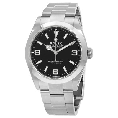 Silver-tone stainless steel case with oyster bracelet, fixed bezel. Black analog dial featuring silver-tone hands and hour/minute markers, luminous for night readability. Powered by the Rolex Calibre 3230 automatic movement (70-hour power reserve) containing 31 jewels, beating at 28800 vph. Sapphire crystal with scratch resistance, screw-down crown, solid case back. Includes international warranty card and complete accessories.