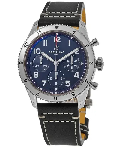 Authentic Breitling Classic Avi Chronograph 42, model A233801A1C1X1, 'Tribute to Vought F4U Corsair' watch featuring a blue dial. Equipped with automatic movement powered by Caliber 23 engine and offering up to 48 hours power reserve. Includes bi-directional rotating bezel, folding clasp closure, silver tone hour markers, sub-dials displaying 60 seconds, 30 minutes, and 12 hours. Sapphire crystal lens resistant to scratches. Round stainless steel case measuring 42mm in diameter with a thickness of 14.7mm and solid case back. This men's timepiece is water-resistant up to 100 meters or 330 feet. Comes with a black calfskin leather strap and includes a 2-year WatchMaxx warranty.