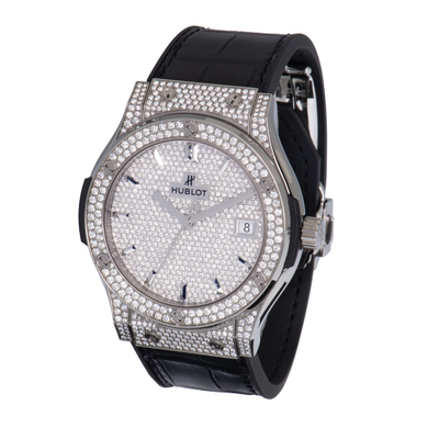 Titanium case with grey diamond pave dial, set with 218 brilliant cut diamonds and silver-tone hands/index hour markers. Fixed bezel in grey with 126 brilliant cut diamonds. Analog display at the 3 o'clock position includes date function. Powered by Hublot Calibre HUB1112 Automatic movement (based on Sellita SW300-1), featuring 25 Jewels, composed of 63 parts, beating rate up to 28800 vph, and a power reserve of about 42 hours. Sapphire crystal provides scratch resistance. Black alligator leather strap secures the round case measuring 45 mm in diameter. Water resistant at 50 meters (165 feet). Watch includes see-through sapphire case back.