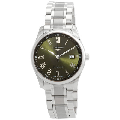 Silver-tone stainless steel case and bracelet with deployment buckle push button release. Round 40 mm case shape featuring a green dial accented by silver-tone hands and Roman numeral hour markers, along with minute markers around the outer rim. Analog dial displaying date at 3 o'clock position powered by Longines Calibre L888 Automatic movement based on ETA A31.L11; this contains 21 jewels, operates at a frequency of 25200 vph, and offers an approximately 64-hour power reserve. Equipped with scratch-resistant sapphire crystal and transparent case back for visibility. Water resistant up to 30 meters or 100 feet depth capable. Functions include hours, minutes, seconds, and date display. Complete original accessories included: branded box, international warranty card, instruction manual. Belongs to the Master Series collection. Luxury style watch labeled Swiss Made.