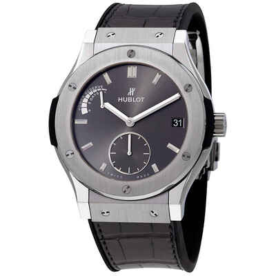 Hublot Classic Fusion Power Reserve Men's Watch model 516.NX.7070.LR features a titanium case, grey dial with analog display (grey hands and index hour markers), fixed titanium bezel, date function at the 3 o'clock position, sapphire crystal glass, screw down crown, transparent case back, powered by Hublot Calibre HUB1601 automatic movement ensuring up to 192 hours of power reserve, small seconds sub-dial. Equipped with a grey leather strap (rubber backing). Round shape measuring 45 mm diameter and 10 mm thick. Water resistant to 50 meters.