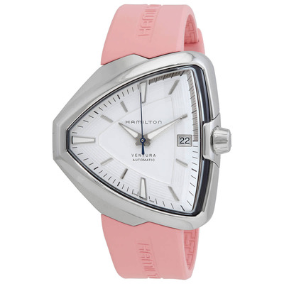 Silver-tone stainless steel case with pink rubber strap. Fixed silver-tone bezel. Analog white dial features luminous dauphine-style hands and hour markers, minute markers on outer rim. Equipped with Hamilton Calibre H-10 automatic movement (based upon ETA C07.111), 25 jewels, beating at 21600 vph, approx. 80-hour power reserve. Scratch-resistant sapphire crystal. Transparent case back. Asymmetric case shape measuring 42.5 mm x 44.6 mm with tang clasp. Includes date display at the 3 o'clock position and is water resistant up to 50 meters/165 feet. Dress watch style, Swiss Made.
