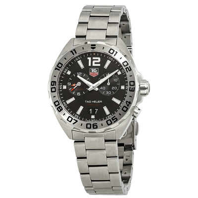 Silver-tone stainless steel case and bracelet. Fixed silver-tone stainless steel bezel. Black dial with luminous silver-tone hands and index- Arabic numeral at the 12 o'clock position hour markers. Dial Type: Analog. Luminescent hands and markers. Date display at the 6 o'clock position. Two sub-dials displaying: 60 second and 12 hour (alarm). Quartz movement. Scratch resistant sapphire crystal. Screw down crown. Screw in case back. Round case shape, case size: 41 mm, case thickness: 12 mm. Band width: 20 mm. Fold over clasp with a safety release. Water resistant at 200 meters / 660 feet. Functions: date, hour, minute, second, alarm. Formula 1 Series. Sport watch style. Watch label: Swiss Made. Pre-owned Tag Heuer Formula 1 Black Dial Mens Watch WAZ111A.BA0875.