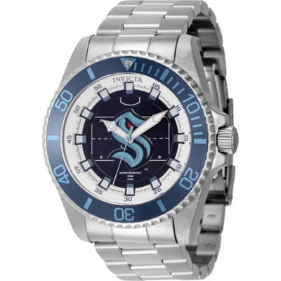 Silver-tone stainless steel case and bracelet. Uni-directional rotating multi-tone (dark blue, white, silver) steel bezel with a blue insert? Or perhaps the entire outer rim is multi-tone including blue colors as stated in data: "multi-tone (dark blue and white and silver and blue)". Blue dial featuring silver-tone hands and index hour markers, also includes minute markers around the outer rim. Equipped with Luminescent hands and markers for enhanced readability. Powered by Hattori Caliber PC21 quartz movement (Japanese origin as per data). Features a scratch-resistant Flame Fusion crystal. Includes pull/push crown and solid case back. Round case shape measuring 47 mm in diameter (approx. 1 inch, though inches are also specified separately). Accompanied by a blue dial display type: Analog with second hand functions. Band is 24 mm wide and measures 7.50 inches when fully extended (including clasp). Secured with fold-over safety clasp. Water resistant up to 100 meters / 330 feet depth, suitable for swimming or diving. Part of the Invicta NHL Series inspired by the Seattle Kraken team.