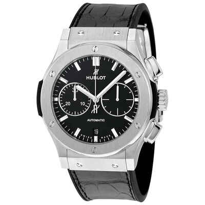 Grey titanium case with black alligator leather strap and fixed grey titanium bezel. Black dial displays silver-tone hands and index hour markers, plus minute markers around the outer rim. Analog dial type features a date display at the 6 o'clock position. Chronograph functions include two sub-dials for seconds and minutes. Powered by Hublot Calibre HUB1143 automatic movement (based on ETA 2892-A2), containing 59 jewels, operating at 28800 vph with a ~42-hour power reserve. Equipped with scratch-resistant sapphire crystal glass, pull/push crown operation, transparent case back, and round case size of 45 mm. Band width is 20.3 mm secured by a fold over clasp. Water resistant up to 50 meters / 165 feet.