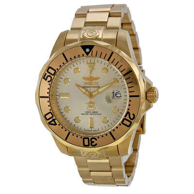 Gold-tone stainless steel case and bracelet. Uni-directional rotating gold-tone bezel with a gold aluminium ring. Champagne dial with luminous gold-tone arrow-shaped hands and dot hour markers. Minute markers around the outer rim. Dial Type: Analog. Luminescent tritnite hands and markers. Date display at the 3 o'clock position. SII caliber NH35A automatic movement, containing 24 Jewels, bitting at 21600 vph, and has a power reserve of approximately 41 hours. Scratch resistant Flame Fusion crystal. Screw down crown. Transparent case back. Round case shape. Case size: 47 mm. Case thickness: 16 mm. Band width: 22 mm. Band length: 9.5 inches. Fold over clasp with a safety release. Water resistant at 300 meters / 1000 feet. Functions: date, hour, minute, second. Pro Diver Series. Dive watch style. Watch label: Japan Movt. Invicta Pro Diver Grand Diver Automatic Mens Watch 3051.