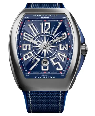 Franck Muller Vanguard Yachting watch, blue dial with silver tone hands and Arabic numeral hour markers plus minute track around outer rim. Features a tenuose shaped stainless steel case measuring 49.95mm x 41mm with thickness of 12.2mm. Equipped with automatic movement (MVT FM 800-DT engine) offering 42 hours power reserve and includes date functionality. Secured by folding clasp and fixed bezel on the case. The scratch-resistant sapphire crystal protects the dial, while providing a water resistance rating of up to 30 meters or 100 feet.