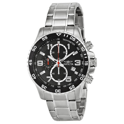 Men's Stainless Steel Watch with Black Textured Dial, Unidirectional Bezel. Features Analog Display (Arabic Numeral & Index Hour Markers), Luminous Hands and Markers, Date at 4 o'clock position, Chronograph Sub-Dials for Seconds (1/10th), Minutes, and Hours, Tachymeter Scale on Outer Rim, Scratch Resistant Mineral Crystal, Standard Pull/Push Crown Control, Solid Case Back. Movement: Quartz. Dimensions: Round Case Shape, Diameter 45mm, Thickness 13mm; Bracelet Width 22mm, Length Adjusts to Approx. 9 inches (full clasp). Clasp Type: Fold Over with Safety Release. Water Resistance: 50 meters / 165 feet suitable for sports.