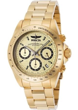 Yellow gold-plated stainless steel case and bracelet. Fixed yellow gold-plated bezel. Gold dial with luminous gold-tone hands and index hour markers. Minute markers around the outer rim. Dial Type: Analog. Luminescent hands and markers. Date display between the 4 and 5 o'clock positions. Chronograph - three sub-dials displaying: 60 second, 60 minute and 24 hour. Caliber: VD53 quartz movement. Scratch resistant mineral crystal. Pull / push crown. Solid case back. Case size: 40 mm. Case thickness: 13 mm. Round case shape. Band width: 20 mm. Band length: 8.25 inches. Fold over clasp with a safety release. Water resistant at 200 meters / 660 feet. Functions: chronograph, tachymeter, date, hour, minute, second. Additional Info: suitable for recreational scuba diving. Casual watch style. Watch label: Japan Movt. Invicta Speedway Chronograph Gold Dial Mens Watch 14929.