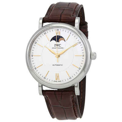 Silver-tone stainless steel case, brown alligator leather strap with fixed silver-tone bezel. Silver dial features rose gold-tone leaf hands and index hour markers including a minute scale inner rim and moon phase subdial. Equipped with IWC Calibre 35800 Automatic movement containing 25 jewels beating at 28800 vph, offering ~42 hours power reserve. Scratch resistant sapphire crystal lens. Pull/push crown operation. Solid case back. Analog dial type displaying hour, minute, second functions plus moon phase. Round shape measuring 40 mm in diameter and 11.1 mm thick. Band width is 20 mm secured by pin buckle clasp. Water resistance up to 30 meters (approx. 100 feet). Swiss Made luxury style watch from the Portofino Moon Phase series.