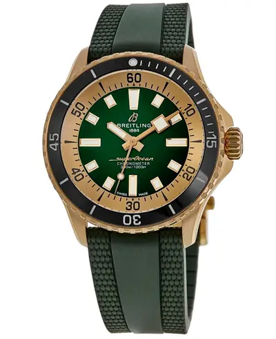 Authentic Breitling Superocean. 42mm bronze case with screw down crown. Green dial features bronze hands and index hour markers, minute markers around outer rim. Equipped with automatic movement powered by Breitling Caliber 17 engine providing 38 hours power reserve. Includes hour, minute, second, and power reserve functions. Accompanied by a green rubber strap and folding clasp. Features scratch resistant sapphire crystal, unidirectional ratcheted rotating bezel, round case shape measuring 12.5mm in thickness. Rated for 300 meters or 990 feet water resistance. Comes with genuine WatchMaxx warranty.