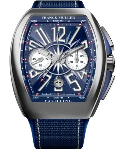 Brand New Authentic Franck Muller Vanguard Yachting watch model V 41 CC DT YACHT (BL) AC. Polished Stainless Steel case in Tonneau shape measuring 49.95mm x 41mm and having a thickness of 12.2mm powered by the automatic MVT FM 2054-C02 movement featuring a 45-hour power reserve. Features date display at 6 o'clock, hour, minute, second hands with minute markers around the outer rim on the blue dial which also displays Arabic numeral hour markers and two sub-dials (Chronograph functions include seconds and minutes). Equipped with scratch-resistant Sapphire crystal, Stainless Steel folding clasp for nylon fabric strap. Water resistant to 30 meters / 100 feet depth and includes a 2 year WatchMaxx warranty.