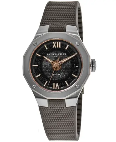Authentic Baume & Mercier Riviera model 10720. New automatic movement watch for men. Features a smoked grey dial accented by brushed/polished stainless steel and titanium case, coupled with a comfortable grey rubber strap. Includes rose gold tone hour/minute hands and Roman numeral/index markers. Power reserve of approximately 120 hours is displayed along with the standard date function. Equipped with sapphire crystal glass for scratch resistance and water resistance up to 100 meters (approx. 330 feet). Comes with a 2-year WatchMaxx warranty.