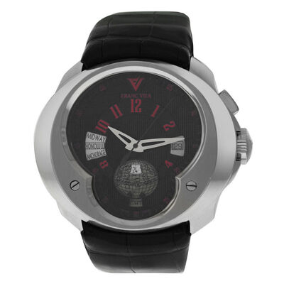 Pre-owned men's watch from the Franc Vila Universal Timezone GMT Series. Silver-tone stainless steel case paired with a black leather strap and features a fixed silver-tone stainless steel bezel.