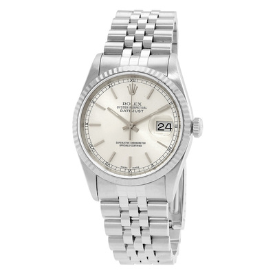 Silver-tone stainless steel case equipped with a silver-tone stainless steel jubilee bracelet. Features a fixed fluted bezel also crafted in silver-tone stainless steel. The display showcases an analog movement on a silver dial, complemented by silver tone hands and luminous stick hour markers, along with minute markers around the outer rim. Powered by the Calibre 3135 automatic movement containing 31 jewels, operating at 28800 vph (bits per hour) with approximately 48 hours of power reserve. The watch is equipped with a scratch-resistant sapphire crystal and features a screw-down crown for ease of use. Includes a solid case back that protects internal components effectively. Round in shape measuring 36 mm, it fastens securely using a fold over clasp system. Water resistant up to 100 meters (or roughly 330 feet), suitable for swimming activities according to standard water resistance guidelines. Functions display hours, minutes, seconds and date; the latter appears through an aperture at the 3 o'clock position. Belongs to the Datejust Series category of luxury watches manufactured by Rolex. This item carries a Swiss Made label as indicated on its face or case back. Pre-owned condition Rolex Datejust Automatic Silver Dial Mens Watch model number 16234SSJ.