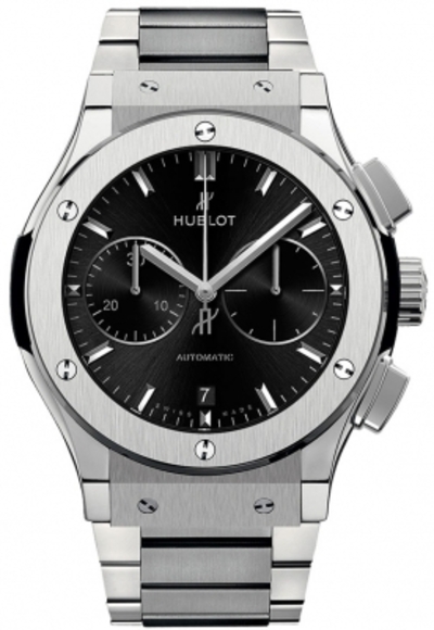 Analog chronograph with date function, fixed titanium bezel, grey titanium case and bracelet, mat black dial with rhodium hands and indices, sapphire crystal glass, exhibition through-case movement (Hublot Calibre HUB1153), automatic winding mechanism featuring 35 jewels, size 42mm, round shape, deployment clasp, water resistant to 50 meters, Swiss Made.
