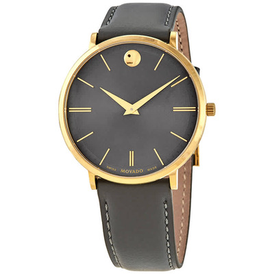 Yellow gold PVD stainless steel case with a grey (calfskin) leather strap. Fixed yellow gold PVD bezel. Grey dial with yellow gold-tone hands and index hour markers. Minute markers around the outer rim. The Movado dot appears at the 12 o'clock position. Dial Type: Analog. Quartz movement. Scratch resistant sapphire crystal. Pull / push crown. Solid case back. Round case shape. Case size: 40 mm. Case thickness: 6.3 mm. Band width: 20 mm. Tang clasp. Water resistant at 30 meters / 100 feet. Functions: hour, minute. Casual watch style. Watch label: Swiss Made. Movado Ultra Slim Quartz Grey Dial Mens Watch 0607376.