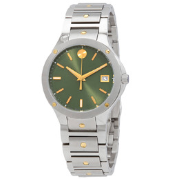 Silver-tone stainless steel case with a two-tone (silver-tone and yellow PVD) stainless steel bracelet. Fixed silver-tone stainless steel bezel. Green dial with gold-tone hands and index hour markers. Minute markers around the outer rim. Dial Type: Analog. Luminescent hands and markers. Date display at the 3 o'clock position. Quartz movement. Scratch resistant sapphire crystal. Pull / push crown. Solid case back. Round case shape, case size: 32 mm. Fold over clasp with a safety release. Water resistant at 50 meters / 165 feet. Functions: date, hour, minute, second. Se Series. Dress watch style. Watch label: Swiss Made. Movado SE Quartz Green Dial Ladies Watch 0607635.