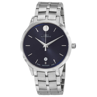 Silver-tone stainless steel case and bracelet. Silver-tone bezel. Blue dial with silver-tone hands and index, dot hour markers. Dial Type: Analog. Date display at the 6 o'clock position. Automatic movement with a 42-hour power reserve. Scratch resistant sapphire crystal. Transparent see through case back. Round case shape, case size: 39 mm, case thickness: 9.6 mm. Deployment clasp. Water resistant at 30 meters / 100 feet. Functions: date, hour, minute, second. 1881 Automatic Series. Watch label: Swiss Made. Movado 1881 Automatic Blue Dial Mens Watch 0607569.