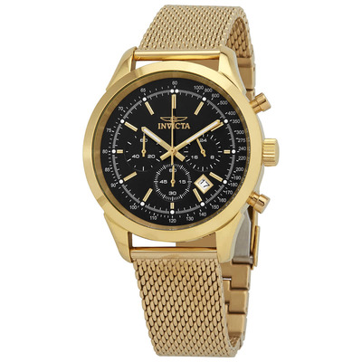 Yellow gold-plated stainless steel case with a yellow gold-plated stainless steel mesh bracelet. Fixed yellow gold-plated bezel. Black dial with gold-tone hands and index hour markers. Minute markers. Tachymeter markings around the outer rim. Dial Type: Analog. Luminescent hands and markers. Date display between the 4 and 5 o'clock positions. Chronograph - three sub-dials displaying: 60 second, 60 minute and 24 hour. Hattori caliber VD53 quartz movement. Scratch resistant flame fusion crystal. Pull / push crown. Solid case back. Round case shape. Case size: 45 mm. Case thickness: 13 mm. Band width: 22 mm. Band length: 9 inches. Fold over clasp with a safety release. Water resistant at 100 meters / 330 feet. Functions: chronograph, date, GMT, second time zone, hour, minute, second. Dress watch style. Invicta Speedway Chronograph Black Dial Mens Watch 25223.