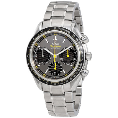 Silver-tone stainless steel case and bracelet. Fixed stainless steel with a black aluminium with tachymeter markings bezel. Grey dial with luminous hands and stick hour markers. Minute markers around the outer rim. Dial Type: Analog. Luminescent hands and markers. Date display at the 6 o'clock position. Chronograph - three sub-dials displaying: 60 second, 30 minute and 12 hour. Omega Calibre 3330 Automatic movement, based upon ETA Valjoux 7753, containing 31 Jewels, bitting at 28800 vph, and has a power reserve of approximately 52 hours. Scratch resistant sapphire crystal. Pull / push crown. Solid case back. Round case shape, case size: 40 mm, case thickness: 15 mm. Band width: 19 mm. Fold over clasp. Water resistant at 100 meters / 330 feet. Functions: chronograph, date, hour, minute, second, chronometer. Speedmaster Series. Luxury watch style. Watch label: Swiss Made. Pre-owned Omega Speedmaster Chronograph Automatic Chronometer Grey Dial Mens Watch 326.30.40.50.06.001.