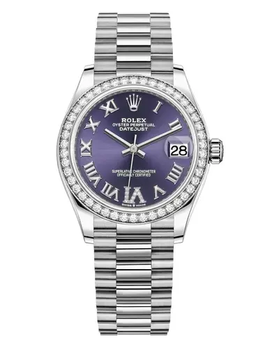Authentic new Rolex Datejust. Polished 18kt white gold case, President bracelet in 18kt white gold with crownclasp. Fixed diamond set bezel. Purple Roman numeral hour markers, polished 18kt white gold hands and diamond pave VI. Automatic movement powered by Calibre 2236 (old name: 7124) with power reserve. Date function at the 3 o'clock position. Screw down crown. Scratch resistant sapphire crystal. Round shape measuring 31mm in diameter. Solid case back. Water resistant up to 100 meters / 330 feet.