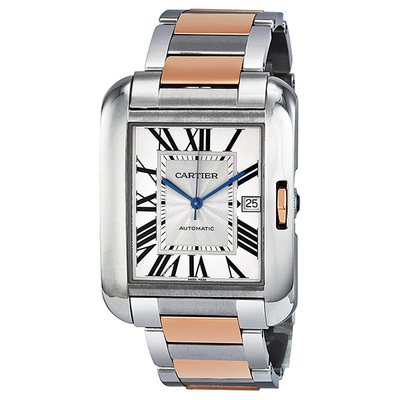 Analog watch, silver-tone stainless steel case, fixed stainless steel bezel. 18kt rose gold bracelet with deployment clasp. Silver dial featuring blued-steel sword hands and Roman numeral markers. Minute markers on inner ring, analog display. Includes date at the three o'clock position. Powered by Cartier Calibre 1904 MC automatic movement (approx. 48-hour power reserve). Equipped with scratch-resistant sapphire crystal. Nine-sided case set with synthetic spinel cabochon crown. Skeleton backplate. Rectangle shape, dimensions: 47mm x 36.2mm, thickness: 9.82mm. Band width is 22mm. Water resistance to 100 feet (approx. 30 meters). Functions include hour, minute, second and date display.